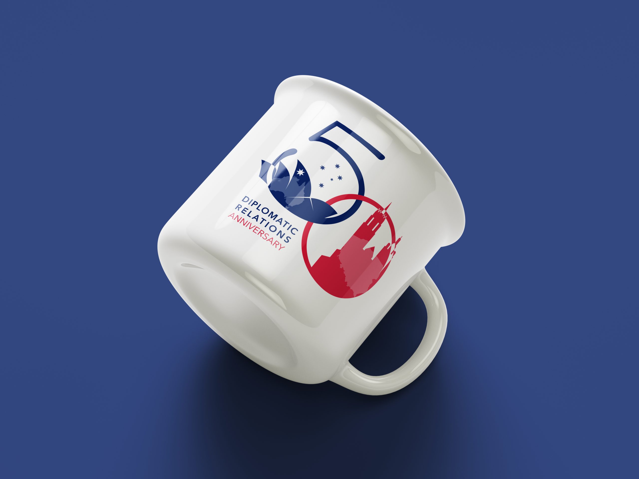 Each component of the “50” design is interconnected to represent the ties that bind the two countries, which are symbolised by their respective iconic structures, the Sydney Opera House and St. Mary’s Basilica. The blue and red hues are taken from the flags of the two countries